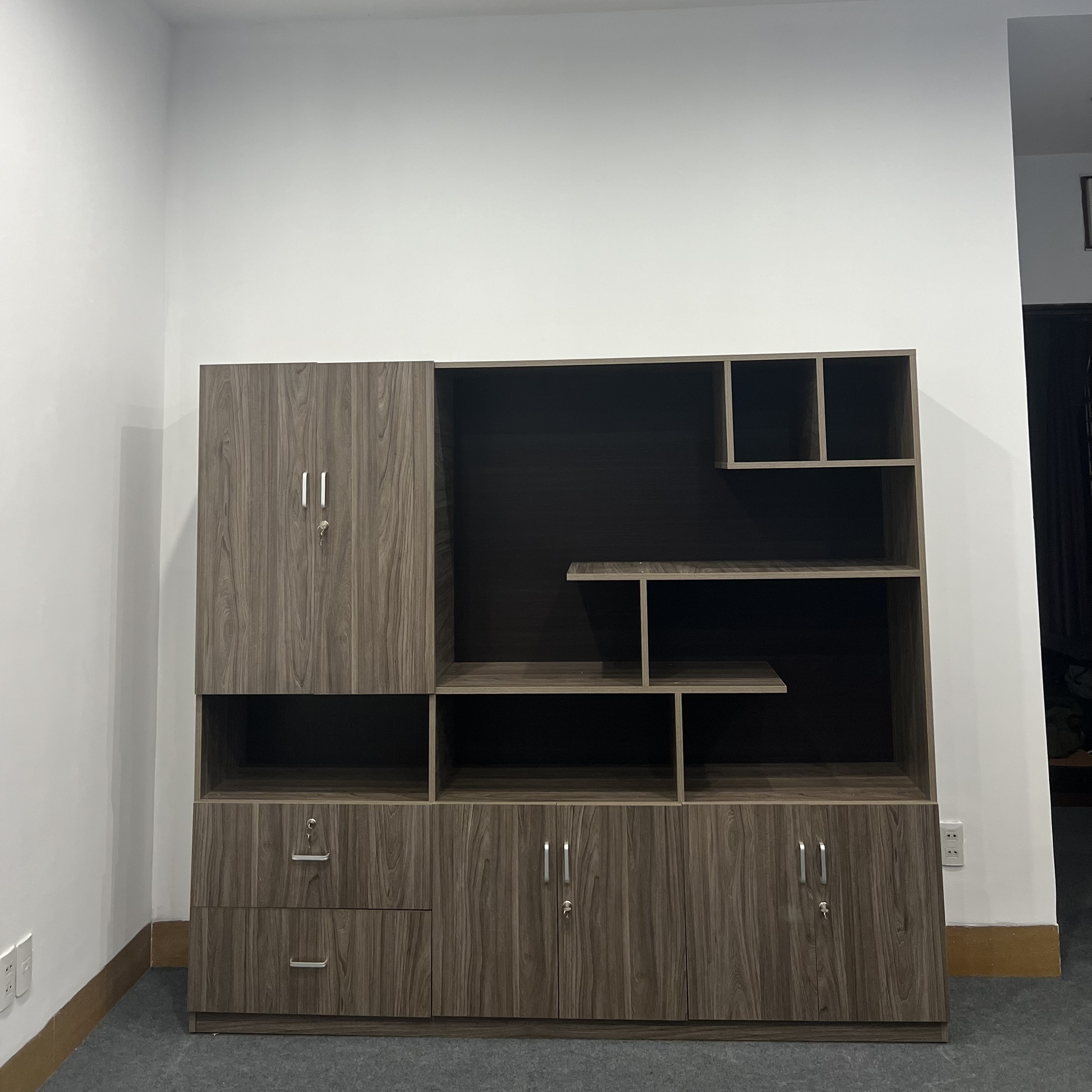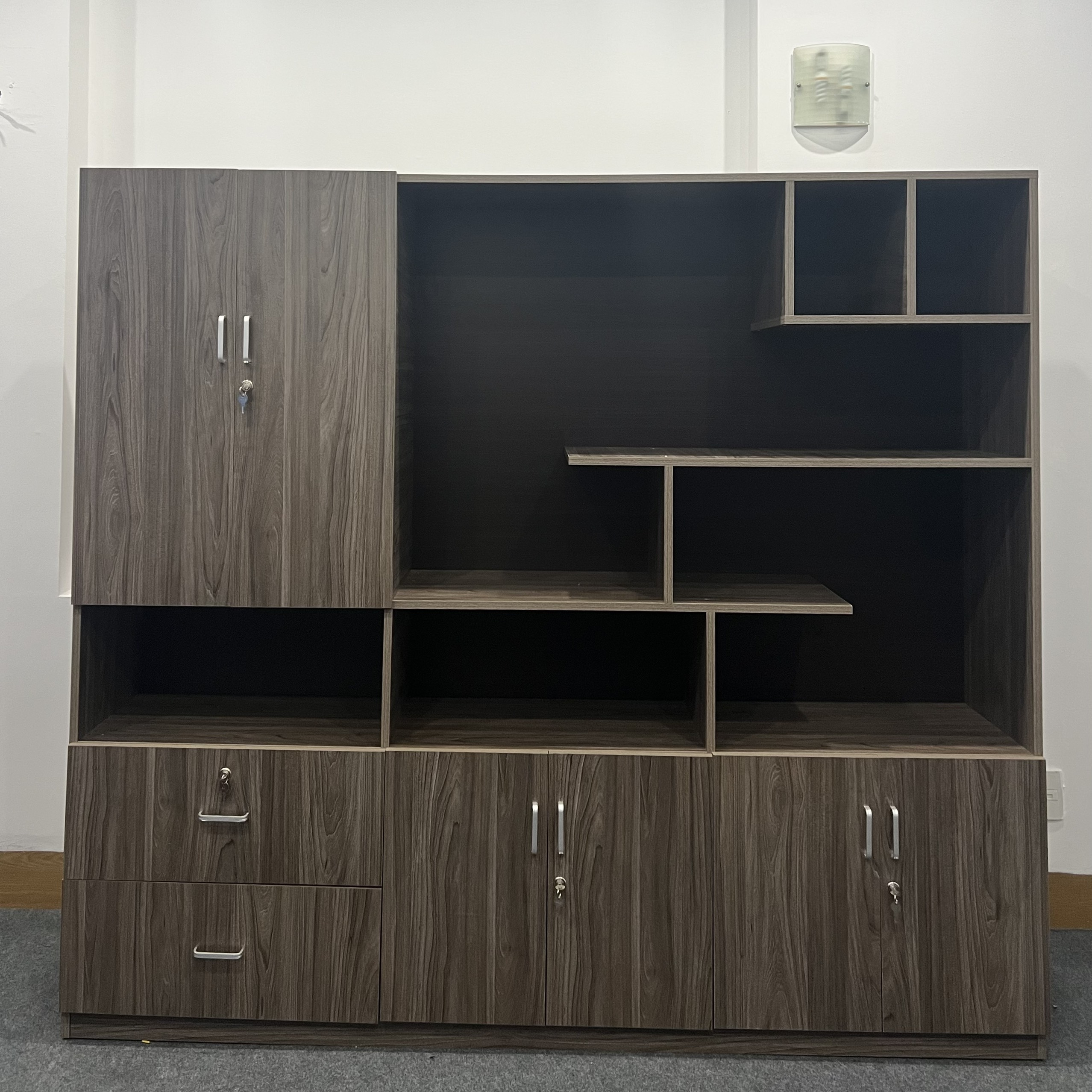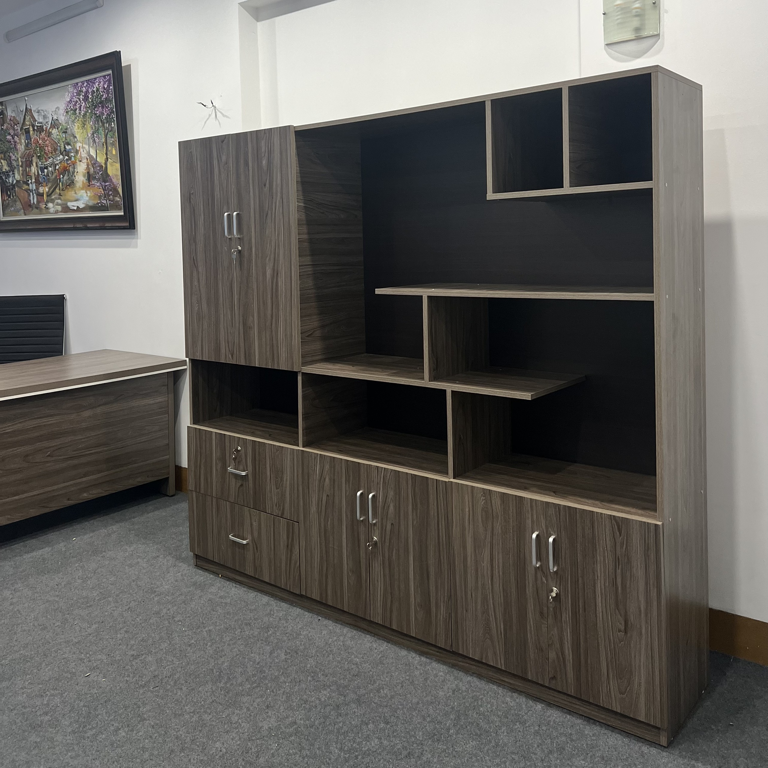 - Tủ kiểu dáng hiện đại thiết kế các cánh tủ ngăn tủ không cánh thích hợp để tài liệu và các vật trang trí cho văn phòng tiện ích